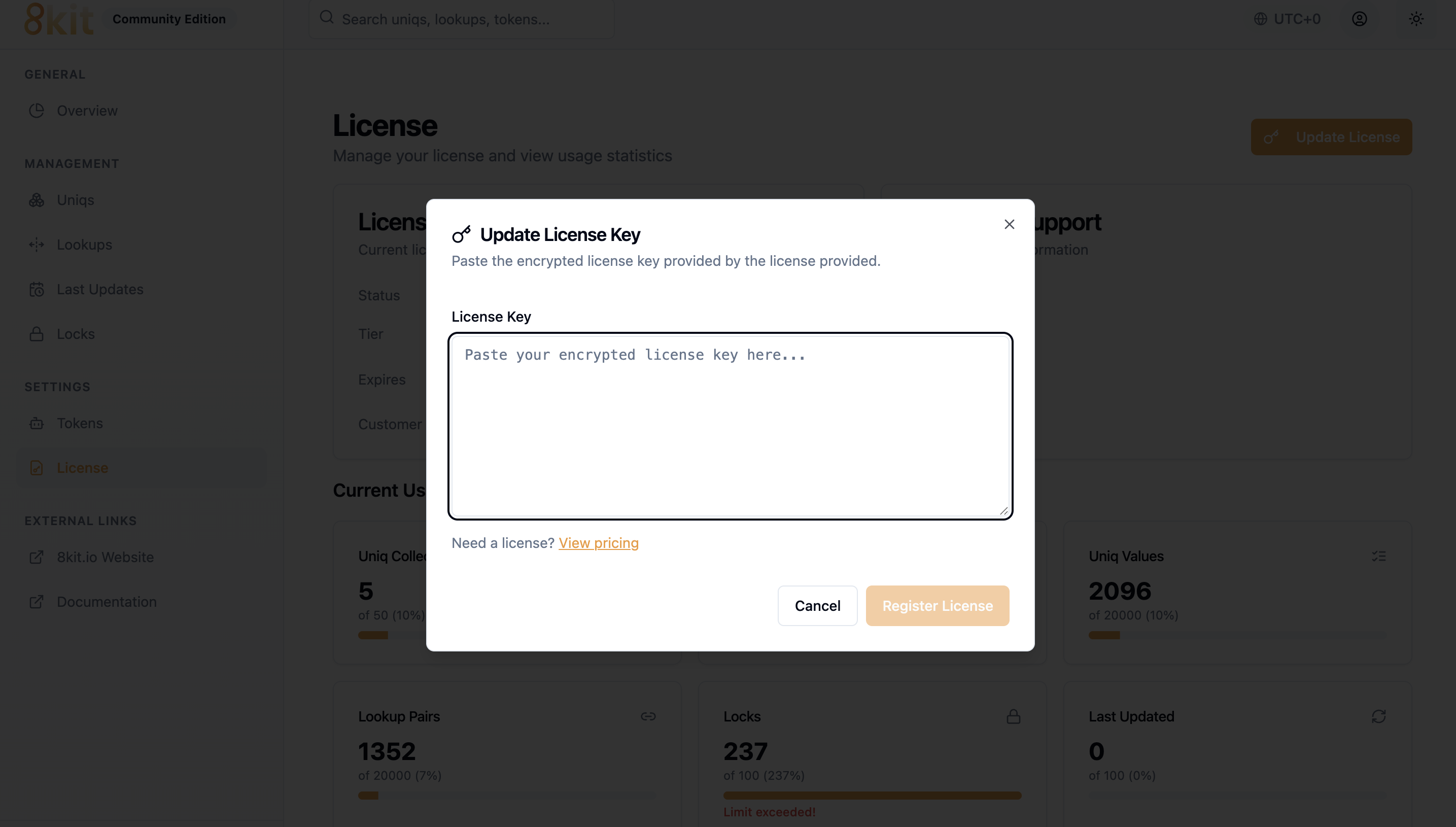 Once you have your license key, activate it in your self-hosted 8kit instance: