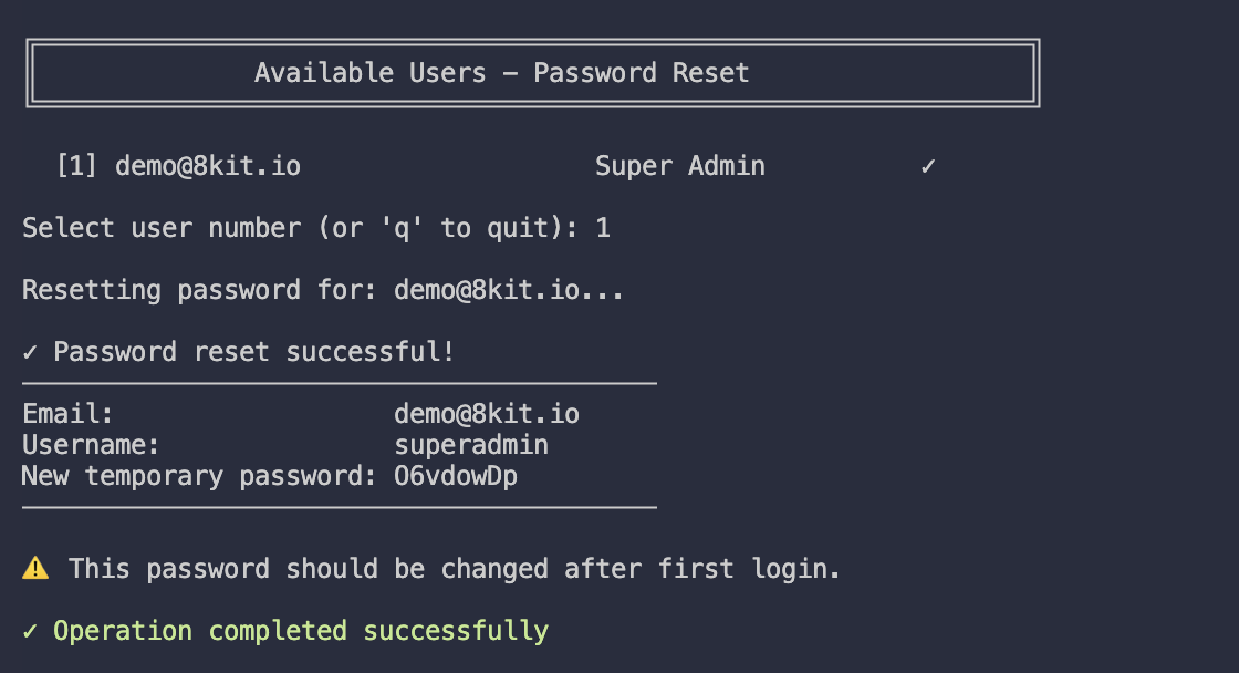 If you need to reset a user password on your self-hosted 8kit instance, connect to your server and run the helper script inside the 8kit container: